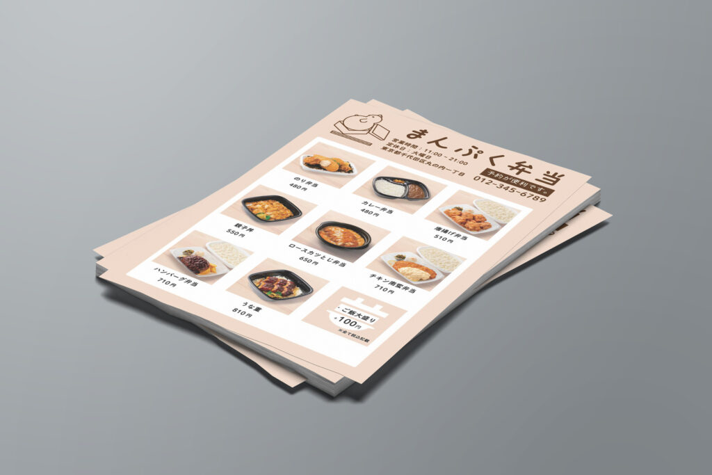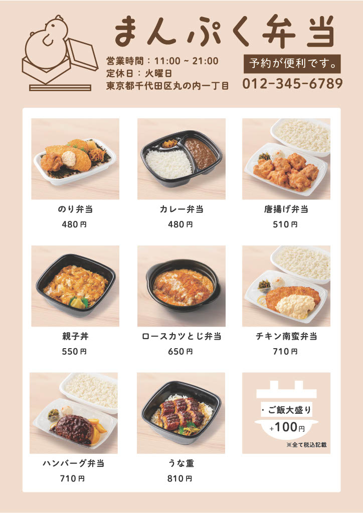 - 「まんぷく弁当」の文字も満腹を表すように丸文字にしてデザイン。