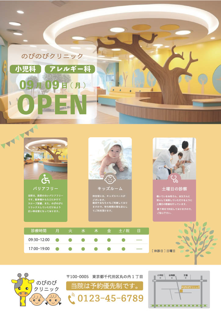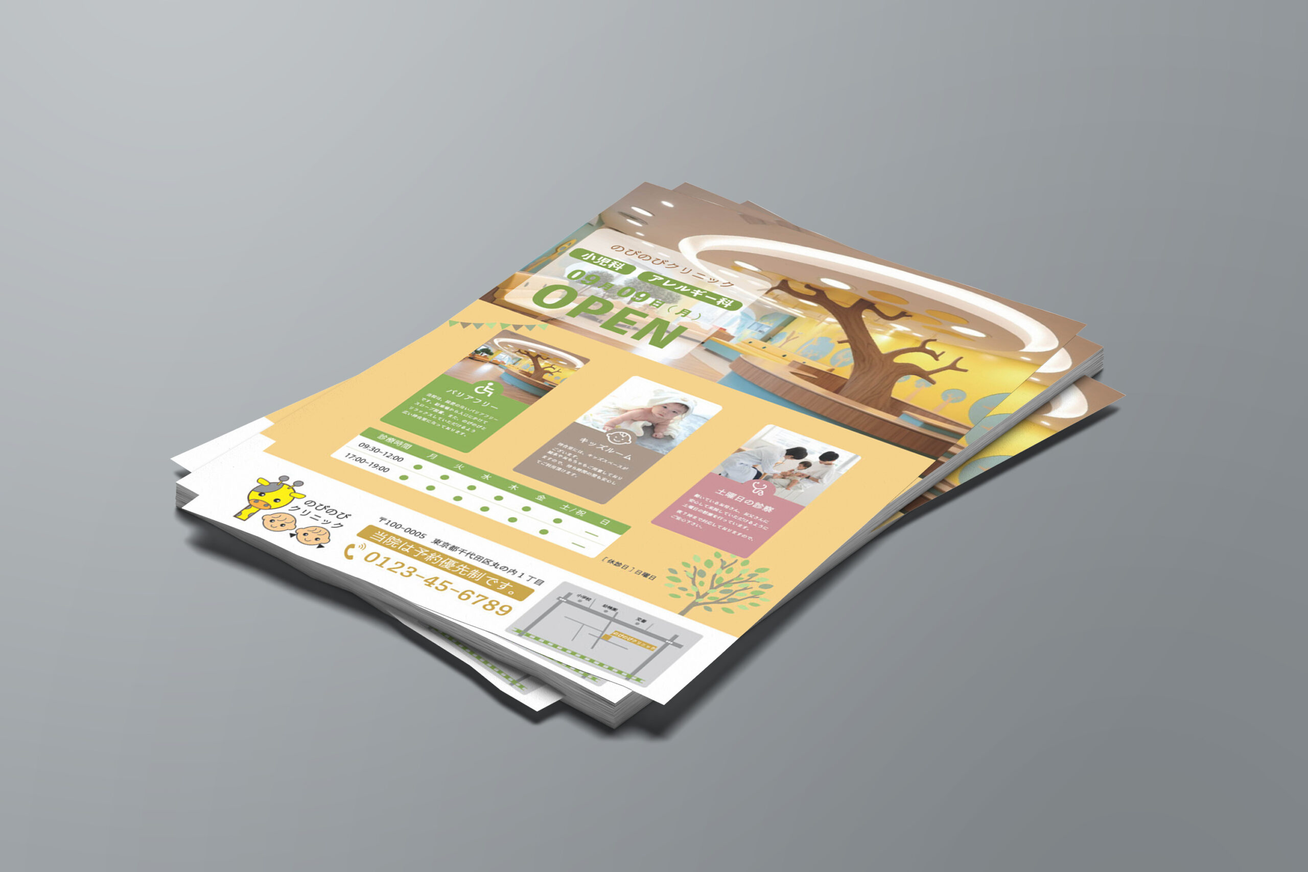 • OPENを告知のチラシの為、クリニック内装(特にモニュメントの木)をメインとした画像を選定。
